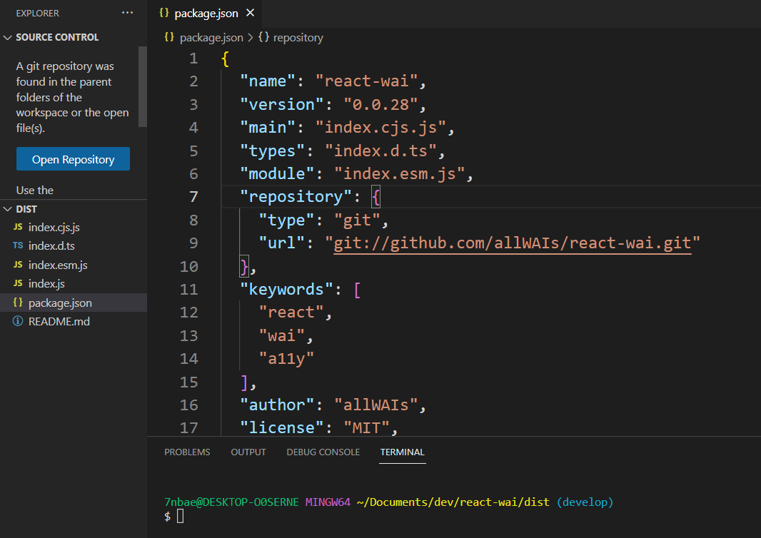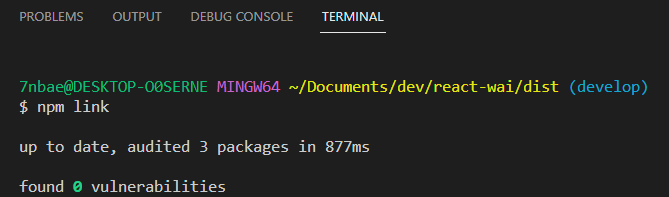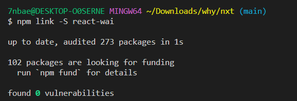 npm link๋ฅผ ์ฌ์ฉํ๋ฉด ํ์ฌ ์ปค๋งจ๋์ ์ง์ ๋ ๊ฒฝ๋ก์ ํจํค์ง๊ฐ ๋ก์ปฌ๋ก ์ ์ฅ๋๋ค. ์๋ฌด๋๋, ํ ์คํธ๋ก๋ง ๋ณด๋ฉด ์ดํด๊ฐ ์๋ ์ ์์ผ๋ react-wai ํ๋ก์ ํธ๋ฅผ ๊ธฐ์ค์ผ๋ก ์ค๋ช ํ๋ฉด ๋ค์๊ณผ ๊ฐ๋ค.